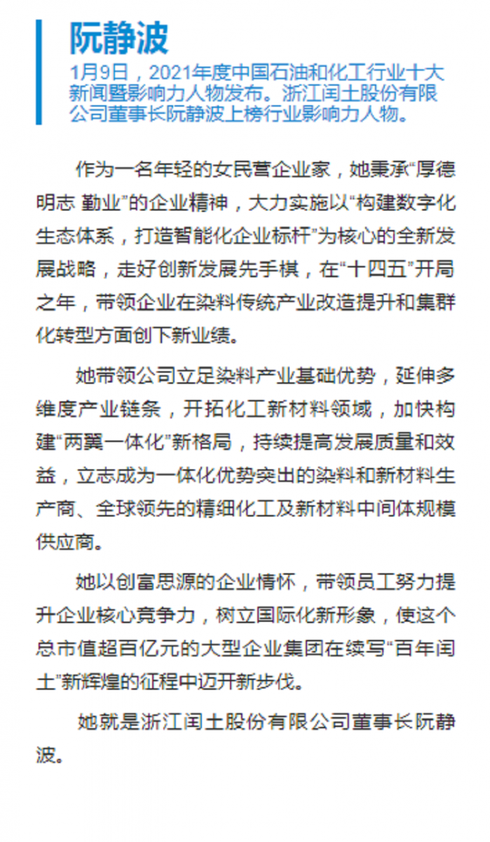 2022年1月9日,由中國石油和化學工業聯合會指導,《中國化工報》社有限公司主辦的“2021年度石油和化工行業十大新聞暨影響力人物發布盛典”采用線上直播的形式舉行。浙江閏土股份董事長阮靜波榮膺“2021年度中國石油和化工行業影響力人物”。